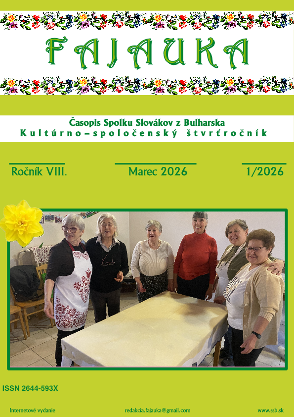 Vyhlásenie o poukázaní podielu zaplatenej dane z príjmov FO (2%) 2025 Aktuálne informácie FAJAUKA 1/2026 už online Internetová TELEVÍZIA Môžete si pozrieť reláciu Poviedačkyhttps://www.ssb.sk/charitativny-koncert_pre-emku_2025/ Kalendár podujatí Divadlo pre deti Dňa 12. 4. (nedeľa) o 14:30 – Bábkové divadlo – Budkáčik a Dubkáčik Radošinské naivné divadlo Dňa 23. 4. (štvrtok) o 19:00 – V Adamovom rúchu. Plavba po Dunaji Dňa 6. 6. (sobota) o 10:00 – hrad Devín Opera Dňa 11. 6. (štvrtok) o 18:00 – Figarova svadba Zájazd - Bihor, Bulharsko, Vojvodina Od 23. 5. – 30. 5. 2026Prihlasujte sa do konca februára! Stretnutie krajanov 2026 Dňa 10. 10. 2026 (sobota) o 13:00 v Clube Cube v Trnave. Kalendár podujatí - pripravujeme Tvorivé dielne Skara Kontaktujte nás Adresa Radničné námestie 9 821 05 Bratislava IČO: 30 810 396DIČ: 2021972601 Telefón +421 907 772 130 Bankové spojenie IBAN: SK32 1100 0000 0026 2781 8489 Email spolokssb@gmail.com Jazyk slovenčina bulharčina angličtina francúzština portugalčina Facebook